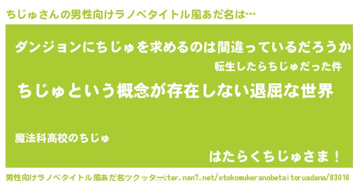 | 胡散臭い通販商品みたいなあだ名 | 『絶対に幸福をもたらす水素水…その名も「ちじゅ」』 |