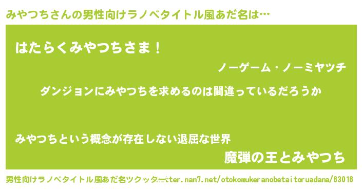 | 女子向けラノベタイトル風あだ名 | 『みやつちの卵を拾いまして』 |