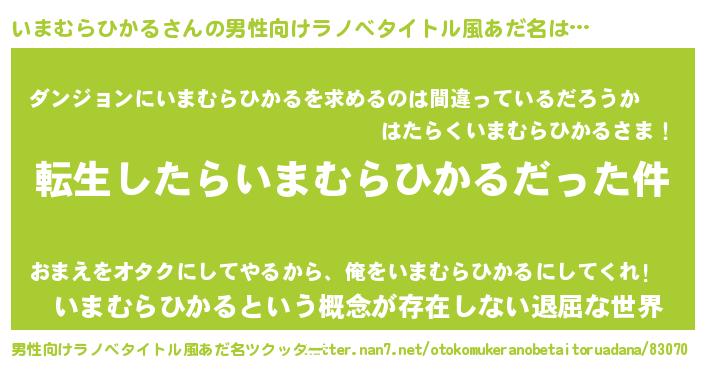 | 女子向けラノベタイトル風あだ名 | 『いまむらひかるの玉の輿計画!』 |