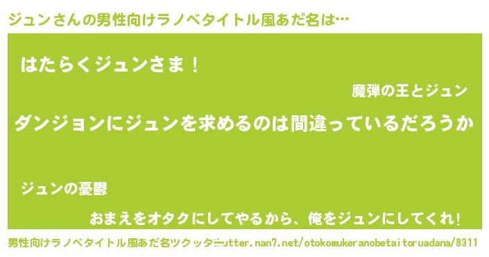 | 女子向けラノベタイトル風あだ名 | 『ジュンの卵を拾いまして』 |
