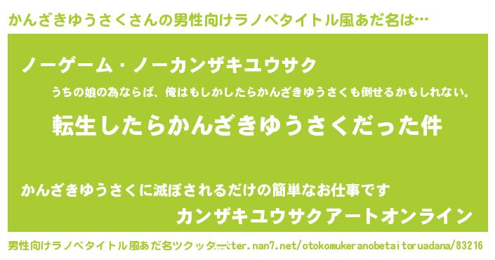 | 女子向けラノベタイトル風あだ名 | 『婚約破棄系悪役かんざきゆうさくに転生したので、保身に走りました。』 |