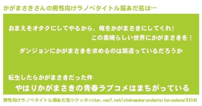 | 胡散臭い通販商品みたいなあだ名 | 『信頼と実績のネックレス…その名も「かがまさき」』 |