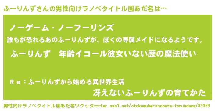 | 女子向けラノベタイトル風あだ名 | 『ふーりんずの玉の輿計画!』 |