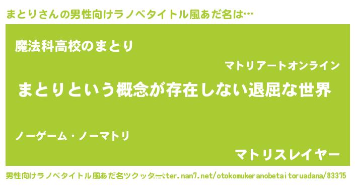 | 女子向けラノベタイトル風あだ名 | 『まとりの契約王妃』『死神まとりの再婚』 |