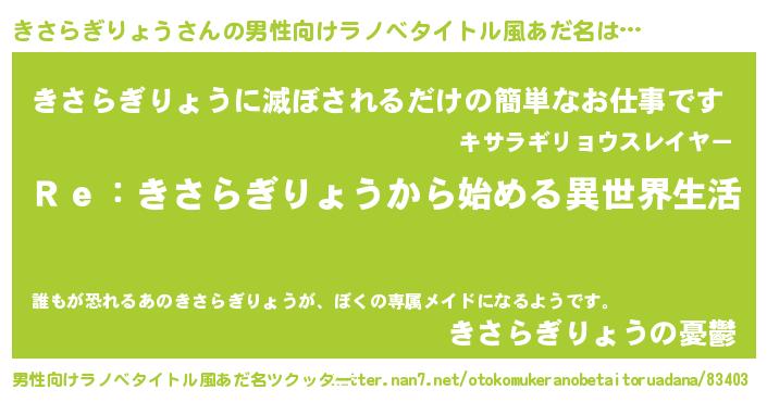 | 女子向けラノベタイトル風あだ名 | 『きさらぎりょうストレイドッグス』 |