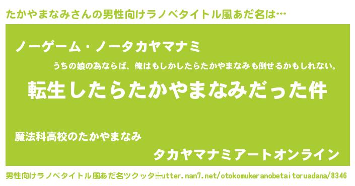 | 女子向けラノベタイトル風あだ名 | 『たかやまなみの玉の輿計画!』 |