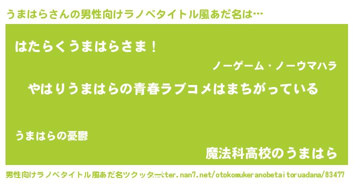 | 女子向けラノベタイトル風あだ名 | 『うまはら伯爵の花嫁』『うまはら恋絵巻』 |
