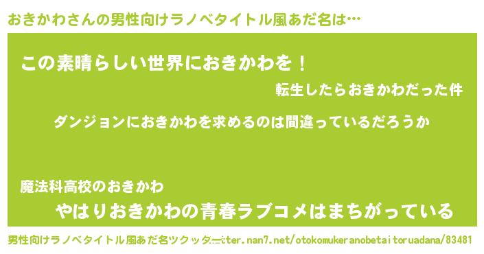 | 女子向けラノベタイトル風あだ名 | 『おきかわの卵を拾いまして』 |