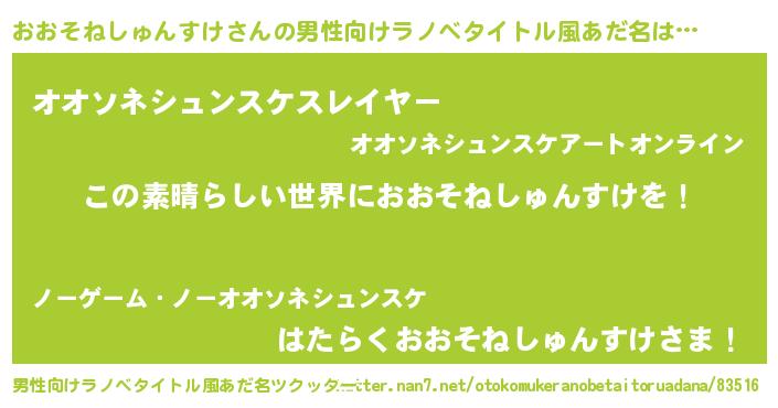 | 胡散臭い通販商品みたいなあだ名 | 『あなたにだけ特別に提供する限定10本のレアな日本酒…その名も「おおそねしゅんすけ」』 |