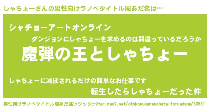 | 意味不明あだ名 | 『住所不定無職しゃちょー(86歳)』 |