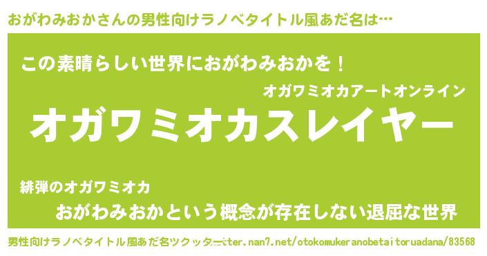 | 女子向けラノベタイトル風あだ名 | 『婚約破棄系悪役おがわみおかに転生したので、保身に走りました。』 |