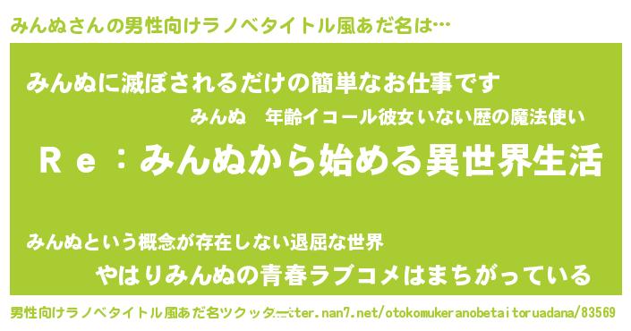 | 女子向けラノベタイトル風あだ名 | 『みんぬストレイドッグス』 |