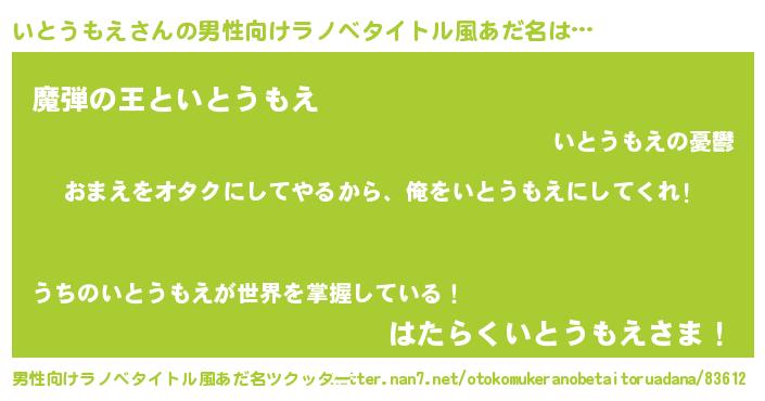 | 女子向けラノベタイトル風あだ名 | 『いとうもえ夫妻のなれそめ』 |