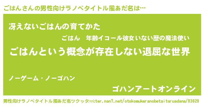| 女子向けラノベタイトル風あだ名 | 『異世界で失敗しない100のごはん』 |