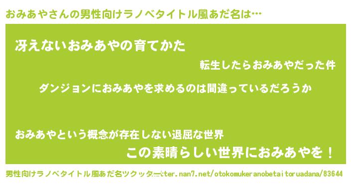 | 胡散臭い通販商品みたいなあだ名 | 『信頼と実績のサプリメント…その名も「おみあや」』 |