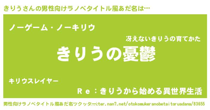 | 女子向けラノベタイトル風あだ名 | 『(仮)きりうのやんごとなき事情』 |