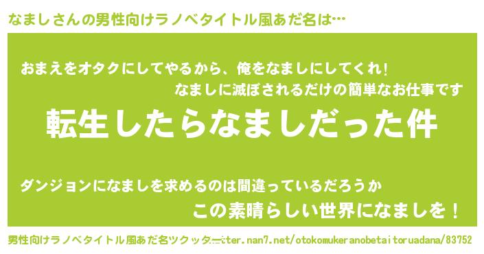 | 女子向けラノベタイトル風あだ名 | 『なましの玉の輿計画!』 |