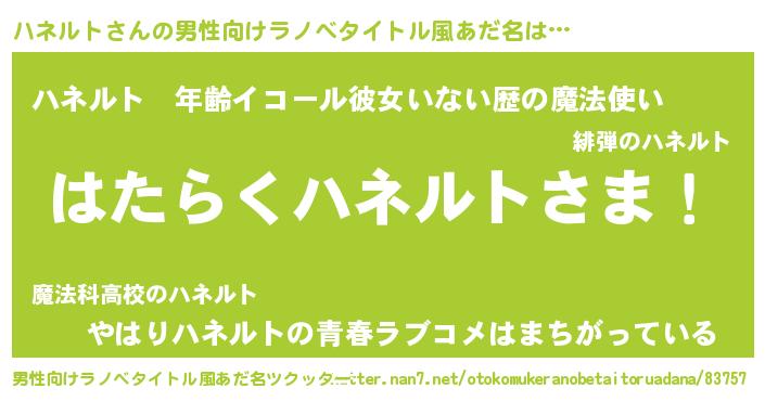 | 意味不明あだ名 | 『めかぶ科ハネルト属』『自称ハネルト』 |