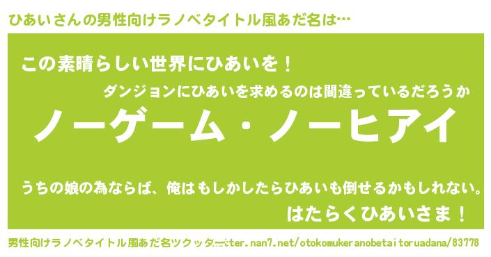 | 女子向けラノベタイトル風あだ名 | 『死神ひあいの再婚』『ひあい伯爵の花嫁』 |