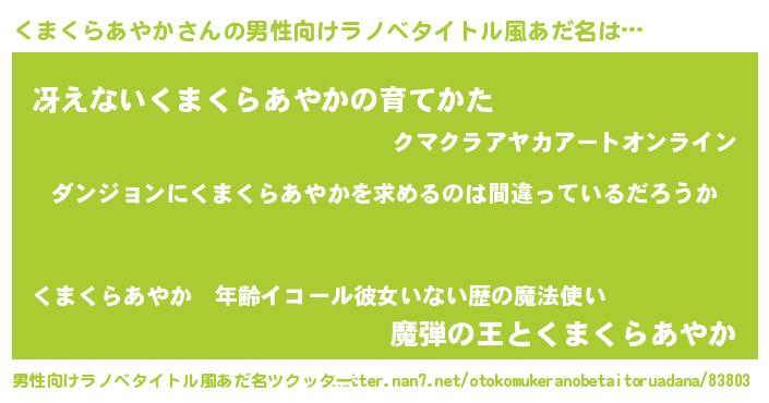| 女子向けラノベタイトル風あだ名 | 『くまくらあやかは平凡を望む』 |