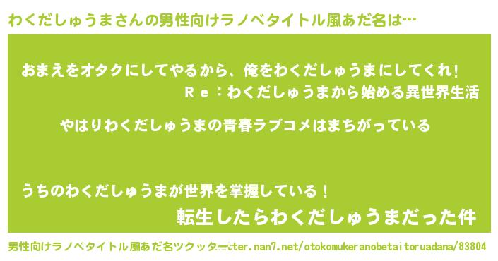 | 女子向けラノベタイトル風あだ名 | 『わくだしゅうまの雑貨屋さん』 |