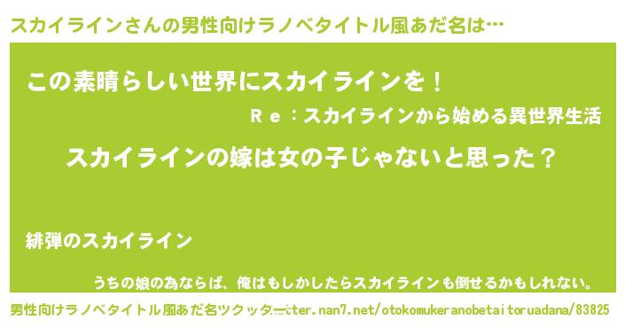 | 女子向けラノベタイトル風あだ名 | 『スカイラインの卵を拾いまして』 |