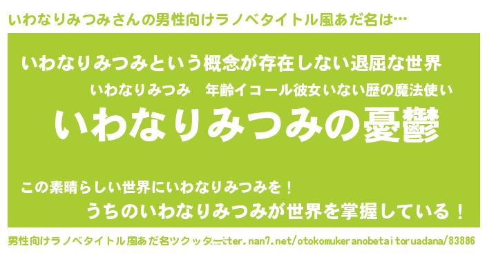 | 女子向けラノベタイトル風あだ名 | 『(仮)いわなりみつみのやんごとなき事情』 |