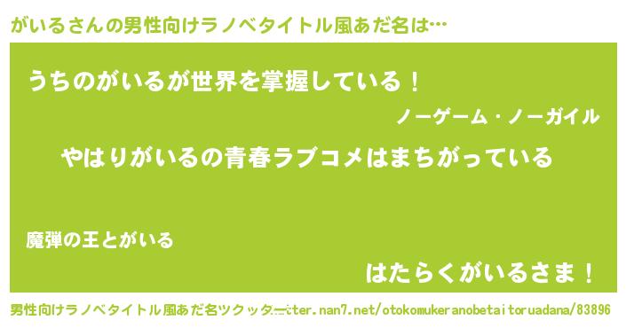 | 女子向けラノベタイトル風あだ名 | 『がいるの雑貨屋さん』『がいる恋絵巻』 |