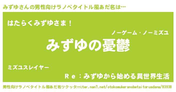 | 女子向けラノベタイトル風あだ名 | 『(仮)みずゆのやんごとなき事情』 |