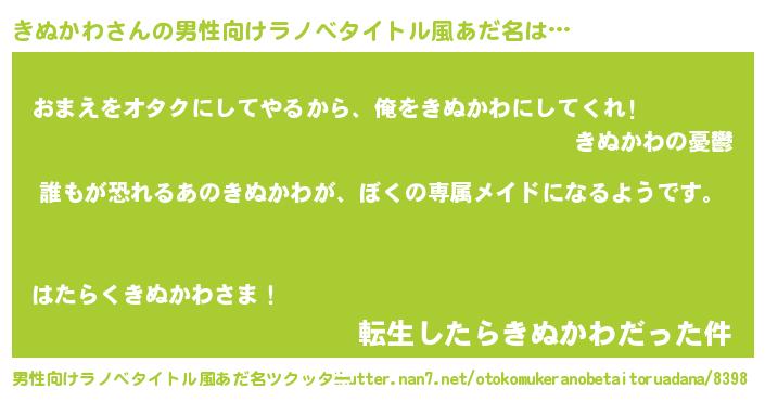 | ヘコむあだ名 | 『きぬかわ(笑)』『きぬっふぃ~』 |
