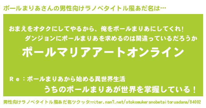 | 女子向けラノベタイトル風あだ名 | 『ポールまりあ姫と円卓の騎士』 |
