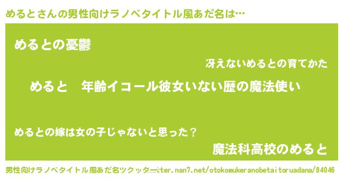 | 女子向けラノベタイトル風あだ名 | 『めるとの玉の輿計画!』 |