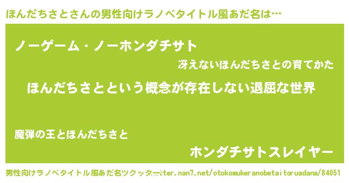 | 女子向けラノベタイトル風あだ名 | 『異世界で失敗しない100のほんだちさと』 |