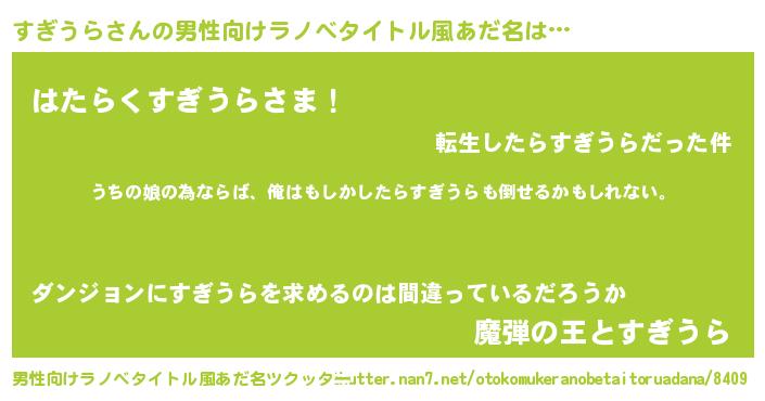 | 女子向けラノベタイトル風あだ名 | 『すぎうら伯爵の花嫁』 |