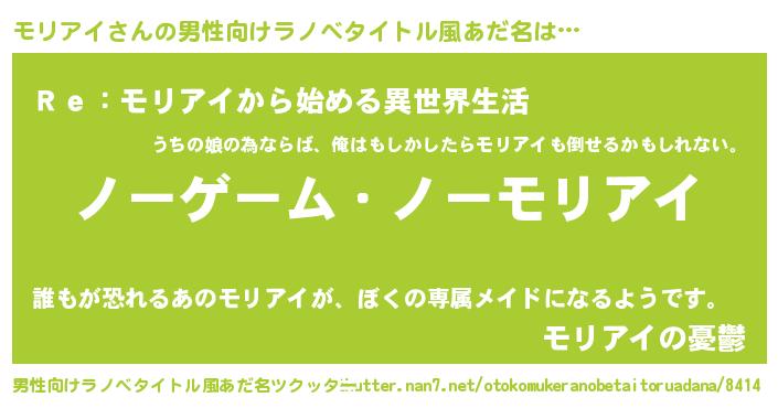 | 女子向けラノベタイトル風あだ名 | 『死神モリアイの再婚』 |