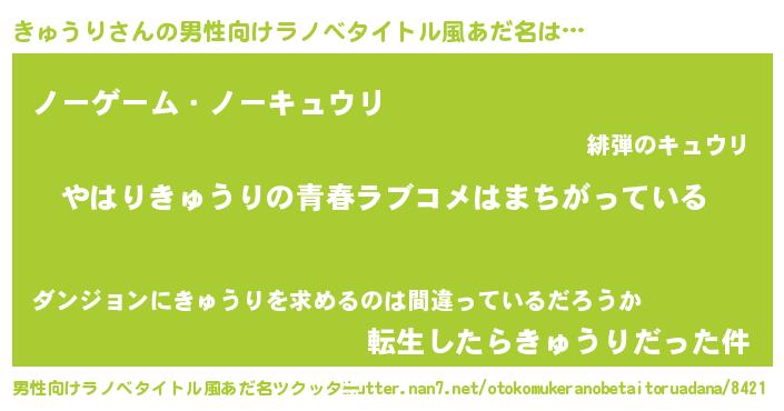 | 女子向けラノベタイトル風あだ名 | 『きゅうり伯爵の花嫁』『きゅうり恋絵巻』 |
