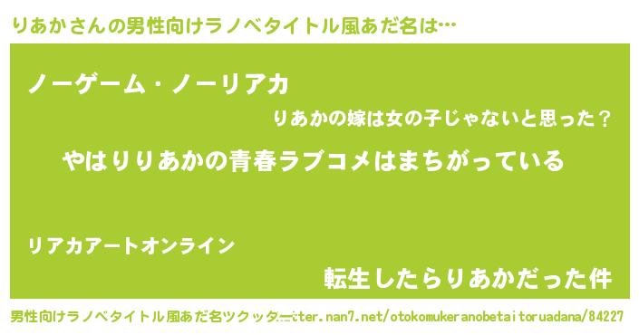 | 女子向けラノベタイトル風あだ名 | 『りあかの雑貨屋さん』『りあか恋絵巻』 |