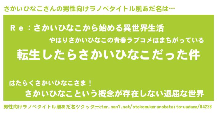 | 女子向けラノベタイトル風あだ名 | 『さかいひなこの玉の輿計画!』 |