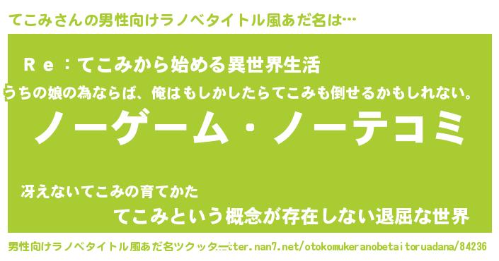 | 女子向けラノベタイトル風あだ名 | 『死神てこみの再婚』『てこみの婚約者』 |