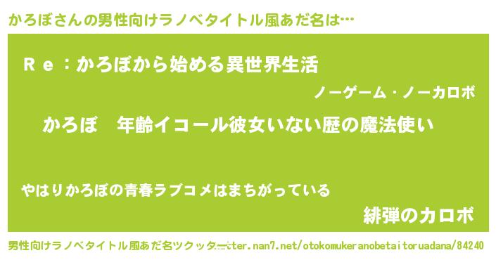 | 女子向けラノベタイトル風あだ名 | 『かろぼの玉の輿計画!』『かろぼ恋絵巻』 |