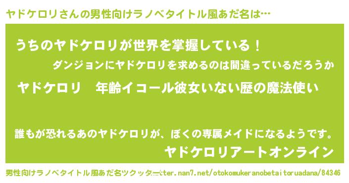 | 女子向けラノベタイトル風あだ名 | 『ヤドケロリの玉の輿計画!』 |