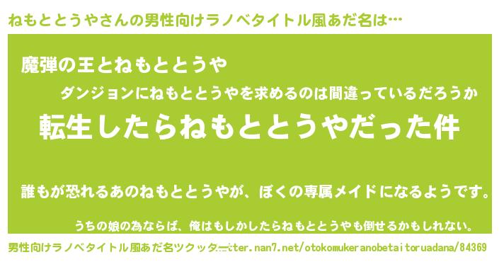 | 女子向けラノベタイトル風あだ名 | 『ねもととうやの玉の輿計画!』 |