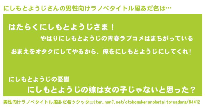 | 女子向けラノベタイトル風あだ名 | 『にしもとようじ夫妻のなれそめ』 |