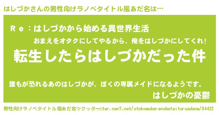 | 女子向けラノベタイトル風あだ名 | 『はしづかの玉の輿計画!』 |