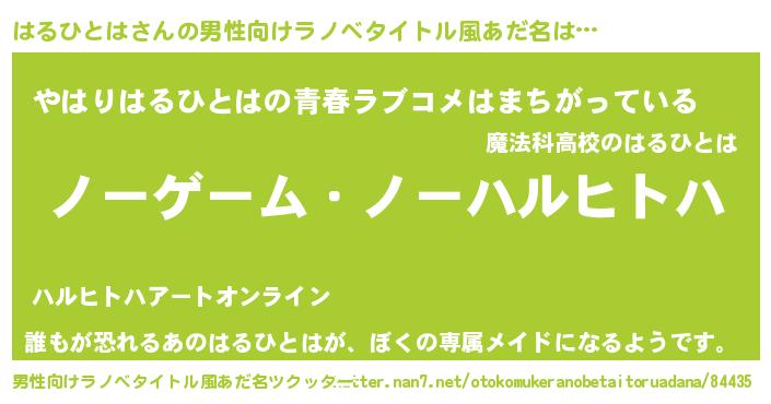 | 女子向けラノベタイトル風あだ名 | 『死神はるひとはの再婚』 |