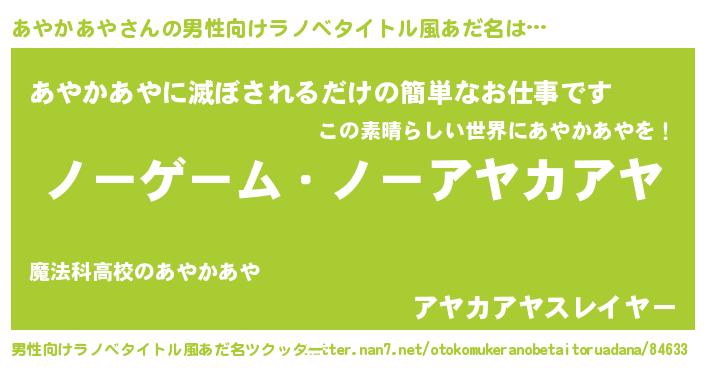 | 伝説のあだ名 | 『救世主となる錬金術士あやかあや』 |