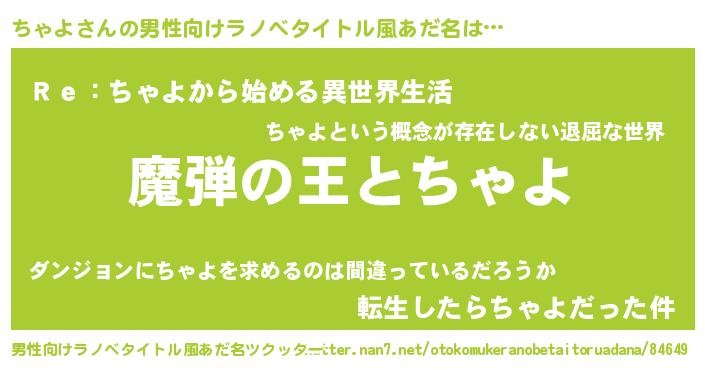 | 女子向けラノベタイトル風あだ名 | 『乙女ゲームの破滅フラグしかない悪役ちゃよに転生してしまった…』 |