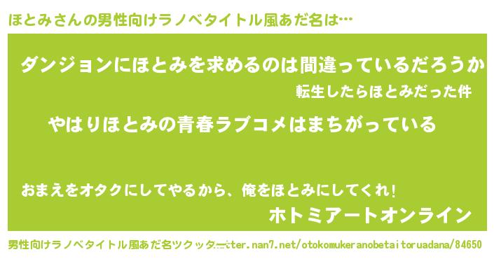 | 女子向けラノベタイトル風あだ名 | 『ほとみの雑貨屋さん』『ほとみ恋絵巻』 |