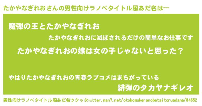 | 女子向けラノベタイトル風あだ名 | 『たかやなぎれおの卵を拾いまして』 |