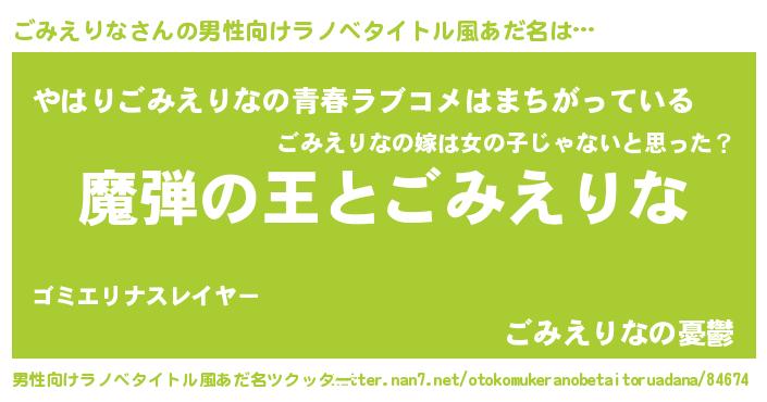 | 女子向けラノベタイトル風あだ名 | 『乙女ゲームの破滅フラグしかない悪役ごみえりなに転生してしまった…』 |